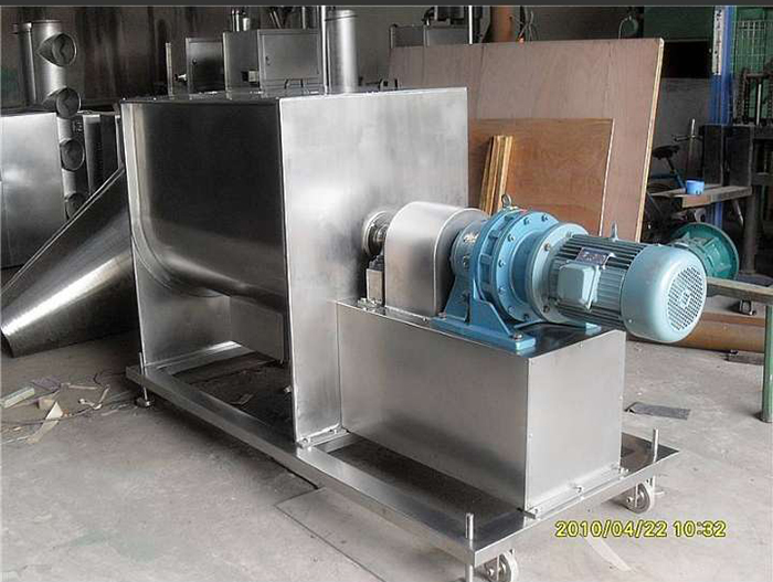 卧式混料机由U形容器、螺带搅拌叶片和传动部件组成;螺带状叶片一般做成双层或三层,外层螺旋将物料从两侧向中间汇集,内层螺旋将物料从中间向两侧输送,形成对流混合。 螺带混合机对于粘性或有凝聚性的粉粒体的混合以及粉粒体中添加液体及糊状物料的混合有良好的效果,筒盖可做成全开式门,以便于对设备进行清洗更换产品。